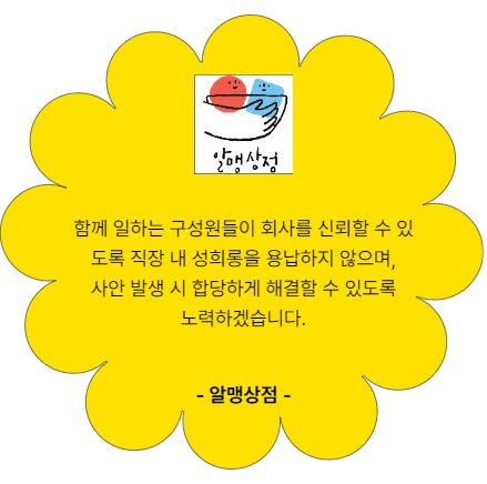 알맹상점. 함께 일하는 구성원들이 회사를 신뢰할 수 있도록 직장 내 성희롱을 용납하지 않으며, 사안 발생 시 합당하게 해결할 수 있도록 노력하겠습니다.모자이크. 성희롱 예방 대응 매뉴얼을 마련하여 건전한 근무 환경이 조성되도록 노력하겠습니다.